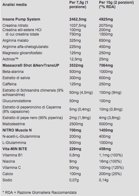 maltodestrine, creatina nitrato, beta-alanina, L-glutammina, aromi, calcio fosfato, L-arginina malato, estratto di salvia (Salvia officinalis) e.s. foglie, L-Arginina alfa cheto-glutarato, N-Acetil-L-Glutammina, trisodio citrato, bicarbonato di sodio, magnesio glicerofosfato, regolatore d'acidità,: acido citrico, creatina etil-estere HCl, acido ascorbico (Vitamina C), edulcoranti: acesulfame K, sucralosio; caffeina, estratto di Schisandra (Schisandra chinensis) e.s. frutto tit. 9% schisandrine, glucuronolattone, antiagglomerante: biossido di silicio, nicotinamide (niacina), Actinos™ (frazione di proteine del siero di latte isolate), coloranti: carminio (nel gusto Bloody Red Orange), estratto di peperoncino di Cayenna (Capsicum annuum) e.s. frutto tit. 8% capsaicina, estratto di pepe nero (Piper nigrum) e.s. frutto tit. 95% piperina, tiamina cloridrato (Vitamina B1).