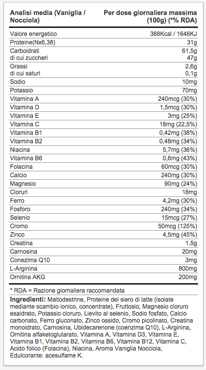 Carboidrati, Proteine, Vitamine, Minerali, Coenzima Q10, Creatina (CREAPURE®), Carnosina, Arginina ed Ornitina AKG.