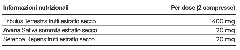 Tribulus (Tribulus Terrestris L.) frutti estratto secco tit. 90% saponine, agente di carica: cellulosa microcristallina; amido pregelatinizzato, avena (Avena sativa L.) sommità estratto secco E/D:1/4, Serenoa (Serenoa repens (W.Bartram) Small) frutti estratto secco tit. 25% acidi grassi, antiagglomeranti: biossido di silicio, magnesio stearato; agenti di rivestimento: idrossipropilmetilcellulosa, acido stearico; colorante: titanio biossido.