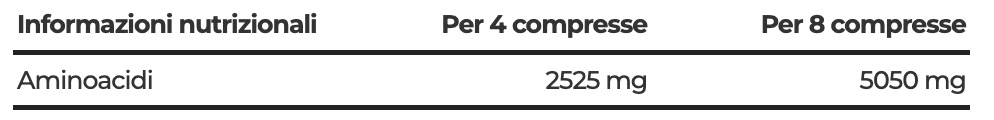 INGREDIENTI:Agente di Carica (Gel di Cellulosa), Peptidi di Glutammina (Da Grano), Proteine della Soia Isolate, Proteine di Pisello, Materiale di rivestimento (Polivinilalcol e Copolimero a Innesto di Alcolpolivinilico e Polietilenglicol, Antiagglomeranti (Talco e Mono e Digliceridi di Acidi Grassi), L-Leucina istantanea (L-Leucina, Emulsionante: Lecitina, Maltodestrine), L-Glutammina, Antiagglomeranti (Sali di Magnesio con Acidi Grassi e Biossido di Silicio), L-Isoleucina, L-Valina.