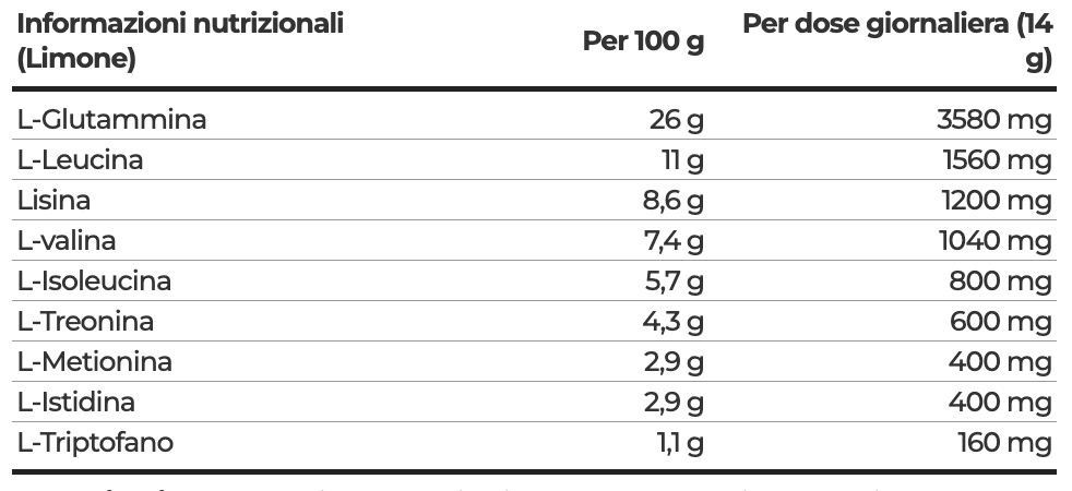 LGlutammina, L-Leucina istantanea (L-Leucina, emulsionante: lecitina, maltodestrine), L-Lisina cloridrato, acidificante: acido citrico, Aroma: limone; L-valina, l-fenilalanina*, l-isoleucina, l-treonina, l-istidina cloridrato, l-metionina, l-triptofano, edulcorante: sucralosio.*Contiene fenilalanina
