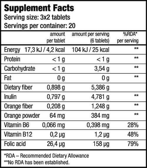 Inulina, Sorbitolo e Aceuslfame K, Fibra vegetale (da Arancia), Arancia in polvere, Antiagglomerante: Magnesio Stearato, Aroma, Colorante: Annatto, Vitamina B6 (Piridossina Cloridrato), Acido Folico, Vitamina B12 (Cianocobalamina)