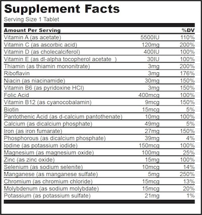 agente di carica: calcio solfato, magnesio ossido, dicalcio fosfato, acido ascorbico, fumarato ferroso, acido folico, antiagglomeranti: acido stearico, magnesio stearato, nicotinamide, zinco ossido, DL-alfa-tocoferile acetato, calcio D-pantotenato, potassio ioduro, manganese solfato, tiamina mononitrato, riboflavina, piridossina cloridrato, retinil acetato, colecalciferolo, biotina, cromo cloruro, sodio molibdato, sodio selenito, cianocobalamina.