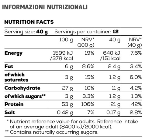 Gusto Protein Blend (whey protein concentrate,whole egg powder, casein, egg white powder), rice flour,flavourings, raising agent (sodium hydrogen carbonate), stabilizer (disodium diphosphate),thickener (xanthan gum), sweeteners (steviol glycosides, sucralose). Made ina plant that also manufactures soy and mustard containing foods.
