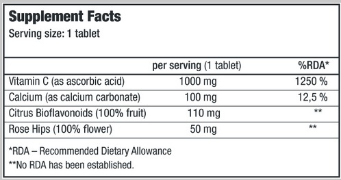 ascorbic acid, calcium carbonate, citrus bioflavonoids (100% fruit), rose hips (100% flower), coating material: hydroxypropyl methyl cellulose, microcrystalline cellulose, magnesium stearate, stearic acid