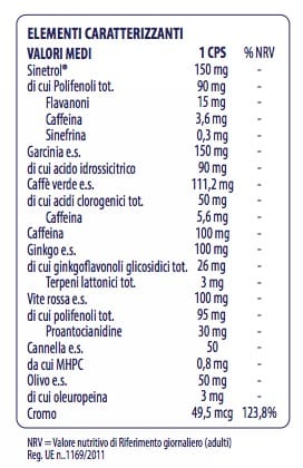 Idrossipropilmetilcellulosa (involucro); Sinetrol ® - estratto di buccia (pericarpo) di agrumi (Citrus aurantium L. var amara, Citrus sinensis (L.) Osbeck, Citrus paradisi Macfad e Citrus grandis Osbeck) e di guaranà (Paullinia cupana Kunt, semi) titolato al 60% polifenoli /10% avanoni /2,4% caeina /0,2% sinefrina; Garcinia (Garcinia cambogia (Gaernt) Desr.) e.s. frutto tit. 60% in acido idrossicitrico; Amido; Caè verde (Coea canephora Pierre ex Froehner) e.s. semi tit. 45 % in acidi clorogenici tot. e 5% in caeina; Caeina; Ginkgo (Ginkgo biloba L.) e.s. foglie tit. 26% in ginkgoavonoli glicosidici tot. e 3% in terpeni