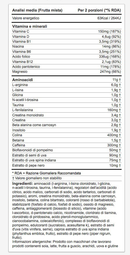 Integratore alimentar e di arginina, vitamine del gruppo B e minerali, con aminoacidi, creatina, caffeina e altri fattori nutrizionali ed edulcoranti, in polvere.