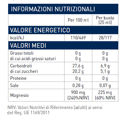 Acqua, Maltodestrine DE1 (6,78 %), Destrosio, Fruttosio, Saccarosio, Magnesio citrato, Magnesio pidolato, Bicarbonato di sodio, Conservante: potassio sorbato; Addensante: xantano; Aroma