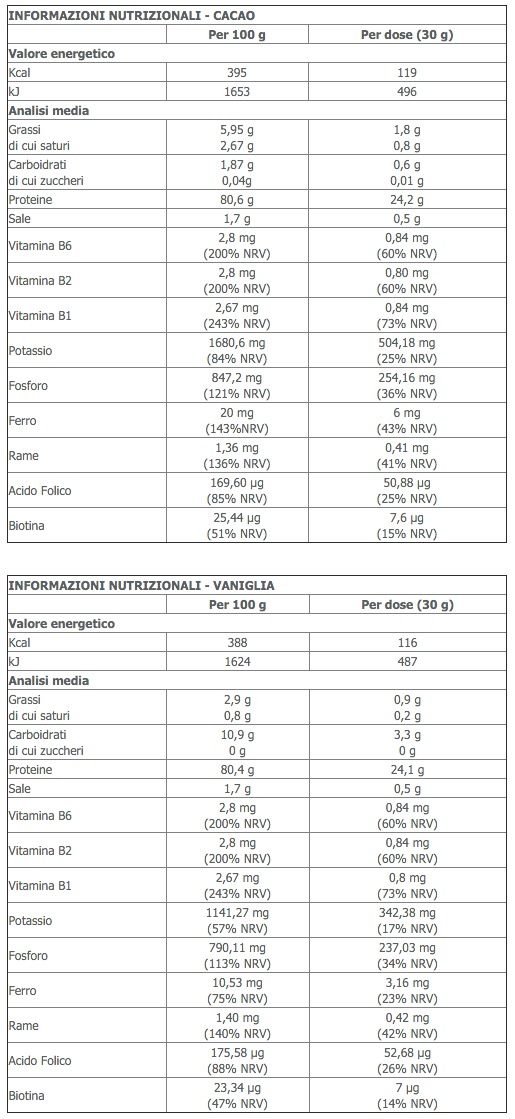 VANIGLIA: Proteine di soia isolate, Maltodestrine (da mais), Aroma, Edulcorante: sucralosio; Vitamina B6 (piridossina cloridrato), Vitamina B1 (tiamina cloridrato), Vitamina B2 (riboflavina).