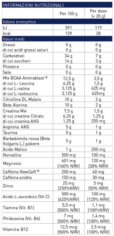 Mix di carboidrati (Maltodestrine DE19, Isomaltulosio** (Palatinose®), Destrina ciclica altamente ramificata (Cluster Dextrin®), Aminoblast® BCAA ( L-leucina, L-isoleucina, L- valina), Beta Alanina, Citrullina malato, Creatina Mix (creatina Alfa-chetoglutarato 1:1, creatina citrato), Arginina Alfa-chetoglutarato, Taurina, Barbabietola rossa (Beta vulgaris L.) polvere, Trimagnesio citrato, emulsionante: esteri di saccarosio degli acidi grassi; aromi, acidificante: acido malico; agente antiagglomerante: biossido di silicio; Norvalina, acido L-ascorbico, zinco gluconato, Caffeina microincapsulata NewCaff® (caffeina, cera candellilla, mono e digliceridi degli acidi grassi), caffeina anidra, edulcorante: sucralosio; Vitamina B6 (Piridossina Cloridrato), Vitamina B1 (Tiamina cloridrato), vitamina B12. **L’isomaltulosio è una fonte di glucosio e di fruttosio.