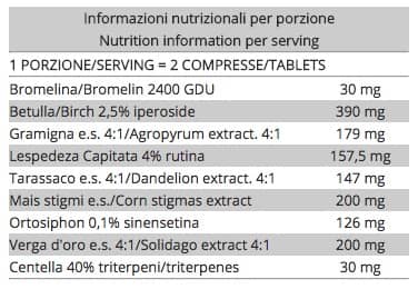 Emulsionante: Cellulosa microcristallina, Betulla* (Betula alba L (sin. Betula pendula Roth.), foglie) e.s. tit 2,5% iperoside; Mais* (Zea mays , stigmi) e.s.; Verga d'oro* (Solidago virga aurea, fiori) e.s. 4:1; Gramigna* (Agropyron repens, rizomi) e.s. 4:1; Lespedeza* (Lespedeza capitata, parti aeree) e.s. tit. 4% rutina; Tarassaco* (Taraxacum officinale, radice) e.s 4:1.; Orthosiphon* (Orthosiphon stamineus, foglie) e.s. tit. 0,1% in sinensetina; Bromelina 2400 GDU; Antiagglomeranti: magnesio stearato vegetale, biossido di silicio; Centella* (Centella asiatica, pianta) e.s. tit. 40% in derivati triterpenici totali. * = Estratti supportati su maltodestrine.