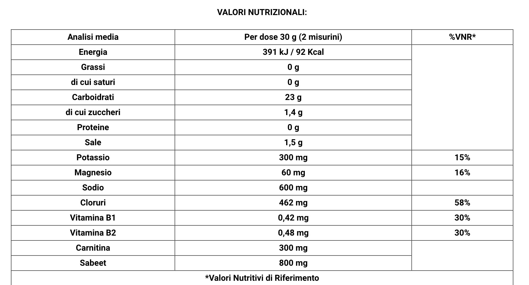 (gusto arancia): Maltodestrine DE6; Sodio Citrato; Magnesio gluconato; Potassio citrato; Sabeet™ (Barbabietola [Beta vulgaris L., radice] estratto secco); Sodio cloruro; Regolatore di acidità: acido citrico; Aromi; Carnitina tartrato; Agenti antiagglomeranti: calcio fosfato, biossido silicio; Edulcorante: Sucralosio; Colorante: beta carotene; Vitamina B2 (Riboflavina); Vitamina B1 (Tiamina cloridrato)