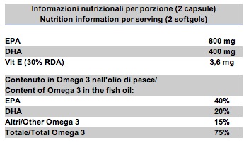 2 capsule = 1 porzione del prodotto contribuiscono al mantenimento della normale funzione cardiaca (EPA e DHA) (l’effetto benefico si ottiene con l’assunzione giornaliera di 250 mg di EPA e di DHA), della normale funzione cerebrale (DHA) e della normale funzione visiva (DHA).