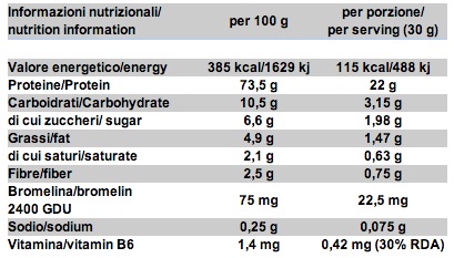 Mix proteico PRO TIME (Proteine del siero di latte concentrate, Calcio caseinato, Proteine del siero di latte isolate mediante ultrafiltrazione a flusso incrociato e microfiltrazione, Proteine del latte isolate, Albume d'uovo); Cacao magro in polvere; Aromi; Emulsionante: lecitina di soia; Bromelina 2400 GDU; Edulcoranti: acesulfame K, sucralosio; Piridossina cloridrato (Vitamina B6).