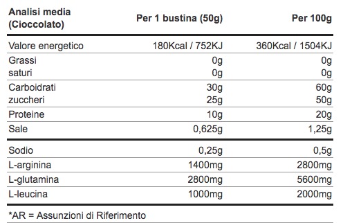 destrosio, sieroproteine isolate, latte scremato in polvere, L-glutamina, cacao in polvere, L-arginina, aromi, L-leucina, sale marino.