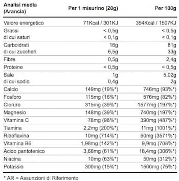 maltodestrine 50%, fruttosio 15%, destrosio 13,4%, sodio citrato tribasico, potassio citrato tribasico, acidificante: acido citrico, calcio fosfato bibasico, sodio cloruro, magnesio citrato tribasico, magnesio carbonato, aroma, vitamina C (acido L-ascorbico, stabilizzante: etilcellulosa), edulcorante: sucralosio, nicotinammide, riboflavina (vitamina B2), colorante: cocciniglia, calcio D-pantotenato, tiamina cloridrato (vitamina B1), vitamina B6 (piridossina cloridrato).