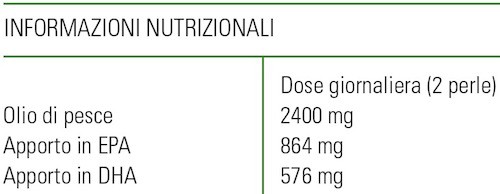 Olio di pesce tit. 36% acido eicosapentaenoico (EPA)/24% acido docosaesaenoico (DHA), antiossidante: alfa-tocoferolo, capsula in gelatina alimentare, glicerina.