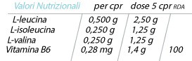 miscela di aminoacidi ramificati (L-leucina, L-isoleucina e L-valina in rapporto 2:1:1), cloridrato di piridossina (Vitamina B6), antiagglomerante: cellulosa microcristallina, magnesio stearato.