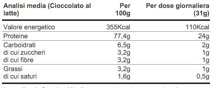 Caseina Micellare, cacao in polvere, aromi, sale, emulsionante: leicitina di soia, addensanti: (carbossimetilcellulosa, gomma di xantano, carragenina), antiagglomerante: biossido di silicio, edulcoranti: sucralosio, acesulfame K. Contiene derivati di latte e soia.