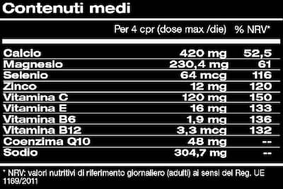 Calcio carbonato, Sodio bicarbonato, Magnesio carbonato, Agente di carica: Cellulosa microcristallina; Potassio bicarbonato, Vitamina C (acido-l-ascorbico, stabilizzante: etilcellulosa), Sodio fosfato monobasico, Antiagglomeranti: Magnesio stearato e Biossido di silicio; Zinco pidolato, Coenzima A10, Vitamina E (dl-alfa-tocoferile acetato), vitamina B6 (piridossina cloridrato), Sodio selenito, Vitamina B12 (cianocobalamina), in vendita su iafstore.com. Senza glutine.