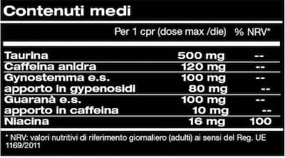 Taurina, Agenti di carica: cellulosa microcristallina, calcio fosfato bibasico; Caffeina anidra, Gynostemma (Gynostemma pentafillum (Thunb) Makino) parti aeree e.s. tit al 80% in gypenosidi, Guaranà (Paullinia cupana Kunth) semi e.s. tit. al 10% in caffeina, Niacina (come nicotinammide), Antiagglomeranti: biossido di silicio e magnesio stearato.