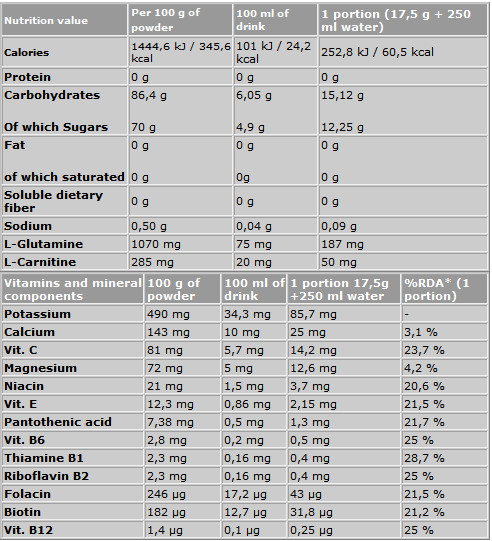 INGREDIENTI:zucchero, maltodestrine, glucosio, fruttosio, acidificante - acido citrico, acido malico, componenti minerali 3,1% (cloruro di sodio, sale di potassio dell'acido ortofosforico, sale di calcio dell'acido ortofosforico, citrato di sodio, carbonato di magnesio), addensanti - gomma arabica, gomma di xantano, sodio carbossimetilcellulosa; aromi, 1,1% di L-glutammina, 0,4% di L-carnitina L-tartrato, 0,23% vitamine (acido L-ascorbico -.vit C, DL-alfa-tocoferil acetato - Vit.E Nicotinamide - Niacina , D-biotina, acetato di retinile -.vit A, calcio D-pantotenato - acido pantotenico, piridossina cloridrato -. vit B6, colecalciferolo -.vit D acido pteroylmonoglutamic - folato, implicita tiamina mononitrato -.vit B1, riboflavina -.vit B2 , cianocobalamina - vit B12), dolcificanti - acesulfame K, sucralosio, ciclammati.; colori: riboflavina (per il gusto al limone), beta-carotene, Carmine, riboflavina (per il gusto all'arancia), E 133 (per il gusto tropic blue), E 150d (per il gusto alla cola)