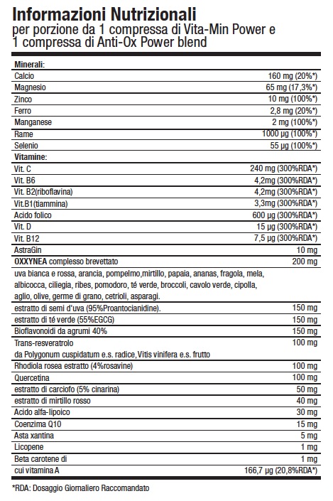 Assumere 1 capsula VITA-MIN POWER e 1 capsula ANTIOX POWER una volta a lgiorno dopo il pasto principale.