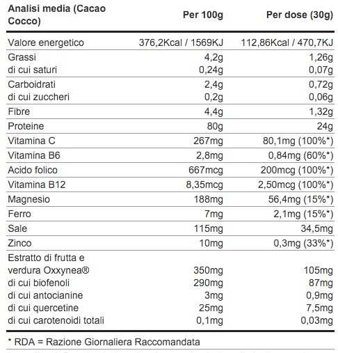 Proteine isolate di soia, proteine isolate di pisello, proteine isolate di riso, Cacao magro in polvere, Aromi, estratto secco di frutta e verdura standardizzato in valore ORAC Oxxynea®, Dolcificanti: Sucralosio, Ossido di Magnesio, Acido Ascorbico (Vitamina C), Ferro fumarato, Zinco Ossido, Calcio pantotenato, Piridossina (Vitamina B6), Acido folico, Cianocobalammina (Vitamina B12).