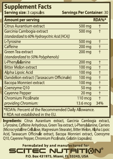 Estratto di Citrus Aurantium (Frutti immaturi, e.s. Tit. al 4% in Sinefrina), Estratto di Garcinia Cambogia (Frutto – estratto titolato al 60% in Ac.Idrossicitrico), L-Tirosina, Caffeina, Estratto di Tè Verde (Camellia Sinensis – Foglie, estratto titolato al 50% in Polifenoli), L-Fenilalanina*, Eccipienti: Cellulosa Microcristallina e Magnesio Stearato, Estratto di Melone Amaro (Momordica Charantia - Frutti, e.s.), Acido Alfa-Lipoico, Estratto di Tarassaco (Taraxacum Officinale – Pianta, e.s.), Estratto di Bacopa Monnieri (Pianta, e.s.), Coenzima Q10, Pepe di Caienna (Capsicum Annuum - Frutti), Cromo Picolinato, Gelatina.