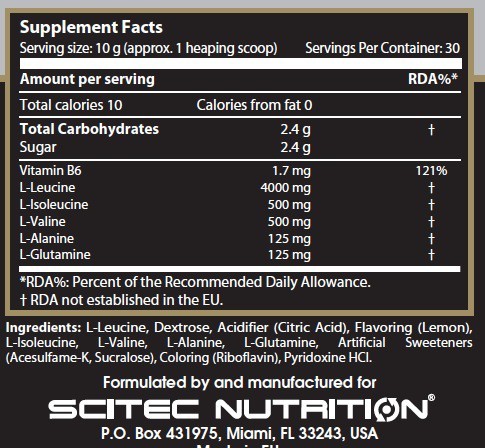 SCITEC NUTRITION - BCAA COMPLEX Tutti sono a conoscenza dell'importanza degli aminoacidi essenziali, in particolare di quelli a catena ramificata. I prodotti normali contengono però un rapporto tra Leucina, Isoleucina e Valina del 2:1:1 anche se le ultime ricerche hanno evidenziato che la Leucina è più importante di quello che si pensasse poiché stimola direttamente la sintesi proteica muscolare, quindi il rapporto classico deve essere aggiornato in un prodotto che porti il corpo al massimo anabolismo e sintesi proteica. Questo si ottiene con quattro grammi di Leucina ogni tre ore.