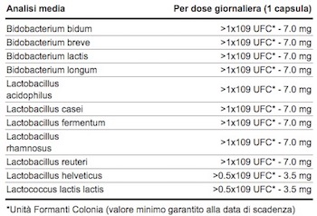 Maltodestrine, Gelatina, Bi¬dobacterium bi¬fidum (Ceppo: BBI 5480), Bi¬dobacterium breve (Ceppo: BBR 6018), Bi¬dobacterium lactis (Ceppo: BLA 5764), Bi¬dobacterium longum (Ceppo: BLO 6300), Lactobacillus acidophilus (Ceppo: LAC 5768), Lactobacillus casei (Ceppo: LCA 5773), Lactobacillus fermentum (Ceppo: LFE), Lactobacillus reuteri (Ceppo: LRE 5454), Lactobacillus rhamnosus (Ceppo: LRH 5326), Antiagglomeranti: Magnesio Stearato e Biossido di Silicio, Lactobacillus helveticus (Ceppo: LHE 1190), Lactococcus lactis subsp lactis (Ceppo: LLA 1676).