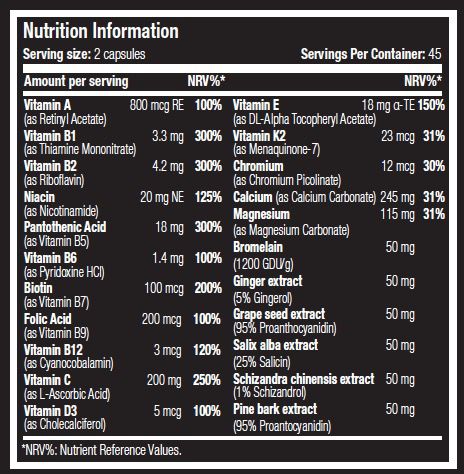 Calcio Carbonato, Gelatina, Magnesio Ossido, Acido L-Ascorbico (Vitamina C), DL-Alfa -Tocoferil-Acetato (Vitamina E), Antiagglomerante: Magnesio Stearato, Bromelina (da Ananas Comosus – 1200 GDU/g), Zenzero (Zingiber Officinalis – Rizoma, e.s. Tit. al 5% in Gingerolo), Estratto di Semi d’Uva (Vitis Vinifera, e.s. Tit. al 95% in Proantocianidine), Salice Bianco (Salix Alba – Corteccia, e.s. Tit. al 25% in Salicina), Schisandra Chinensis (Frutti, e.s. Tit. all’1% in Schisandrolo), Pinus Pinaster (Corteccia, e.s. Tit. al 95% in Proantocianidine), Menachinone-7 (Vitamina K), Calcio D-Pantotenato, Nicotinamide (Niacina), D-Biotina, Retinil-Acetato (Vitamina A), Colorante: Biossido di Titanio, Riboflavina (Vitamina B2), Tiamina Mononitrato (Vitamina B1), Acido Folico, Colecalciferolo (Vitamina D), Piridossina Cloridrato (Vitamina B6), Cianocobalamina (Vitamina B12), Cromo Picolinato.