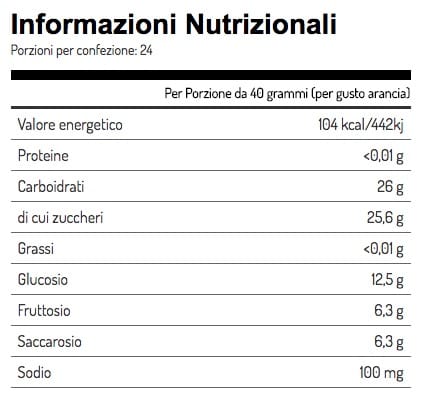 INGREDIENTI:Ingredienti per gusto arancia: Acqua, Destrosio, Fruttosio, Saccarosio, Minerali (citrato di sodio, cloruro di sodio), Acidificante: Acido citrico, Aromi, Gelificante: gomma xantano, Conservanti: Sorbato di potassio e Sodio benzoato.