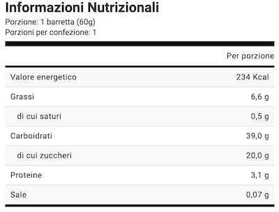 Barretta da 60g, molto digeribile, senza cioccolato, ottima in questo periodo dell’anno perché non si scioglie con il caldo.