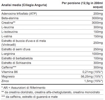 beta-alanina, 10,4% creatina cloridrato, 10,4% creatina alfa-chetoglutarato, 10,4% creatina monoidrato, L-arginina, maltodestrina, aromi, estratto di Schisandra (Schisandra chinensis (Turcz.) Baill. Frutto), L-leucina, 2.3% di caffeina, Estratto di buccia d’uva e di mela (Vinitrox®) (Vitis Vinifera L. e Malus domestica Borkh.), estratto di semi d'uva (Vitis Vinifera L.), adenosinatrifosfato (ATP), carbonato di magnesio, agente antiaglomerante : E551; L-isoleucina, L-valina, Acidificante: E330; Estratto di Barbabietola (Beta vulgaris L. pianta intera), 0,8% estratto di Mate (Ilex paraguariensis A. St.-Hil. Foglia), 0,8% estratto di guaranà (Paullinia cupana Kunth, seme), edulcoranti: E951, E950, E955; zinco ossido, vitamina B6 (Piridossina cloridrato).