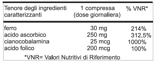 Ferroso gluconato, acido ascorbico (vitamina C), cellulosa microcristallina, idrossipropilmetilcellulosa, antiagglomeranti: silice colloidale, magnesio stearato, vegetale, acido folico, cianocobalamina (vitamina B 12).